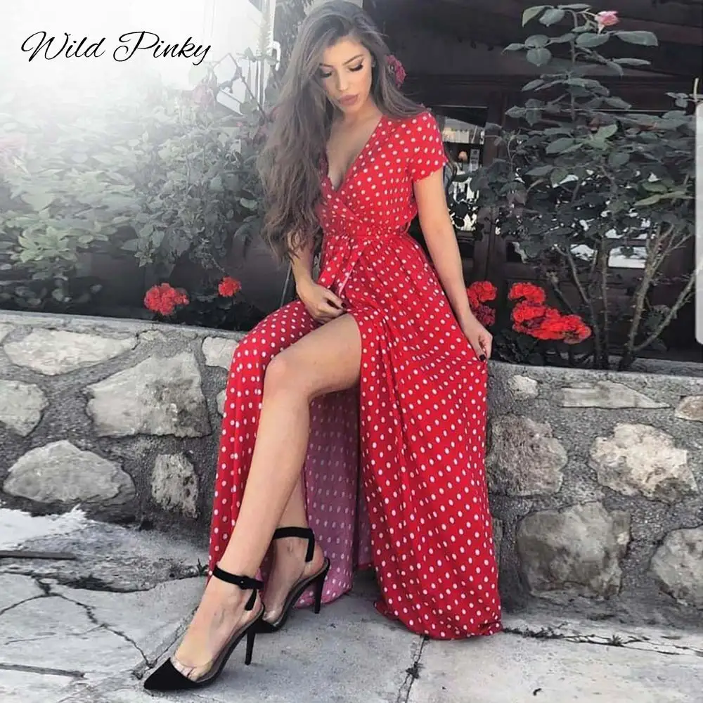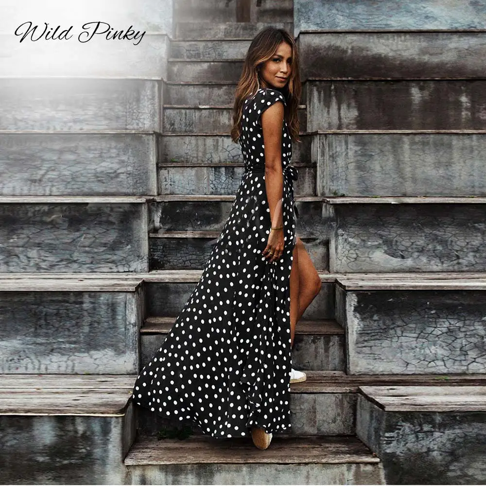 Special Offer WildPinky Boho Polka Dot Long Dresses Women Split Short Sleeve Summer Casual Dress 2019 Streetwear Black Maxi Dress Vestidos Discount 39% Today!