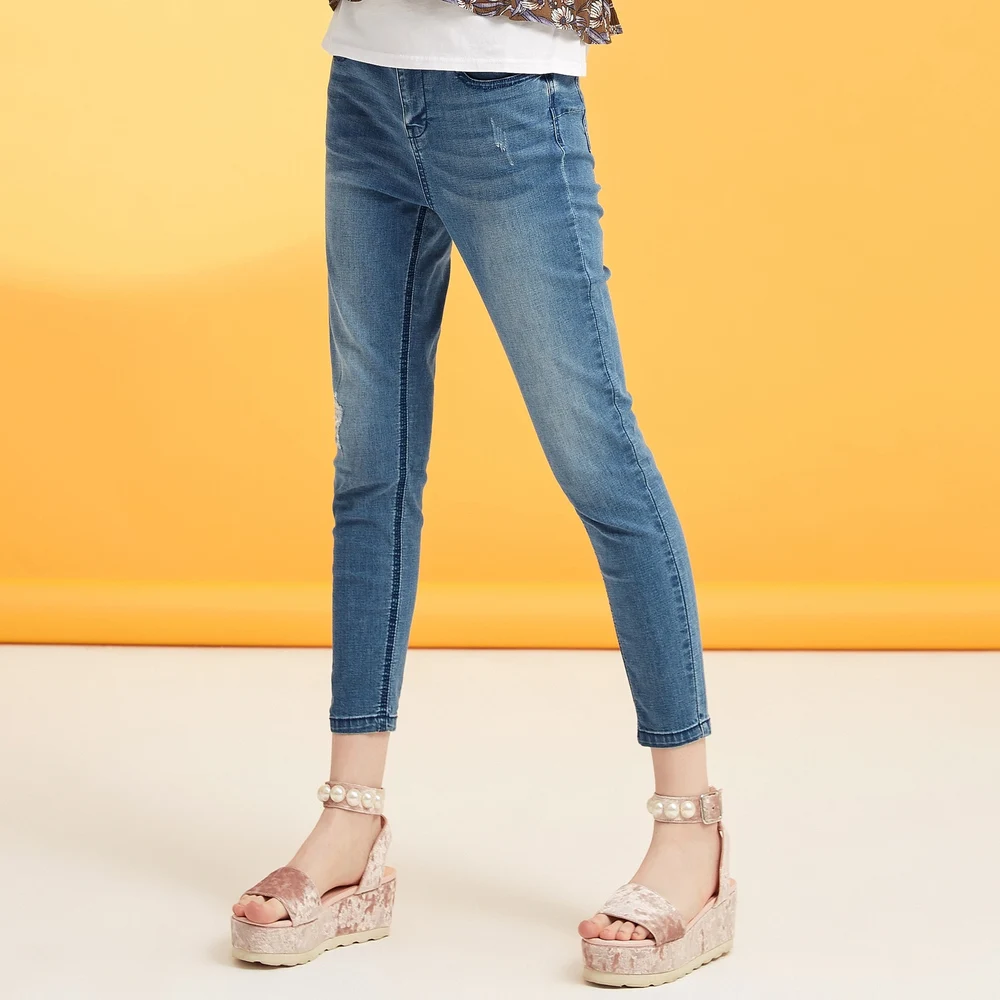 Product Name: Metersbonwe Slim Jeans For Women Jeans Hole Design Woman Blue Denim Pencil Pants High Quality Stretch Waist Women Jeans