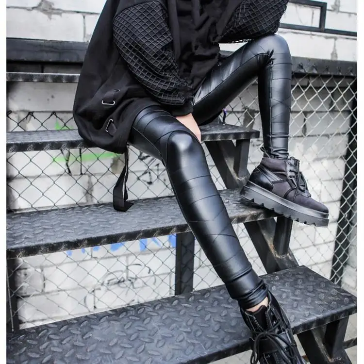 Special Offer Punk Thick Velvet Bandage Leather Leggins Women Sexy Splicing High Waist Warm Leggings Pants Stretch Trousers Discount 30% Today!